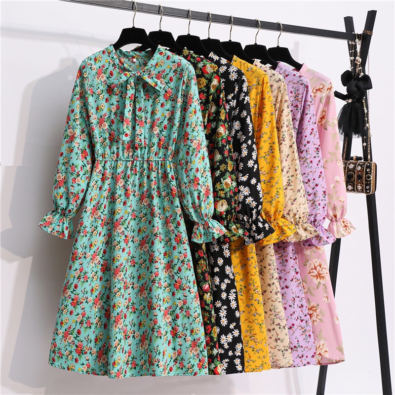 Jual New Fashion Korean Dresses Floral Chiffon Women Casual Dinner Long Sleeve A Line Midi Dress Muslimah Shopee Indonesia